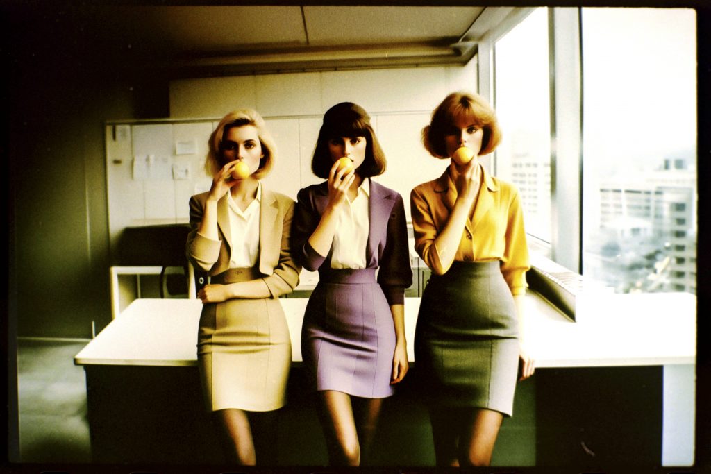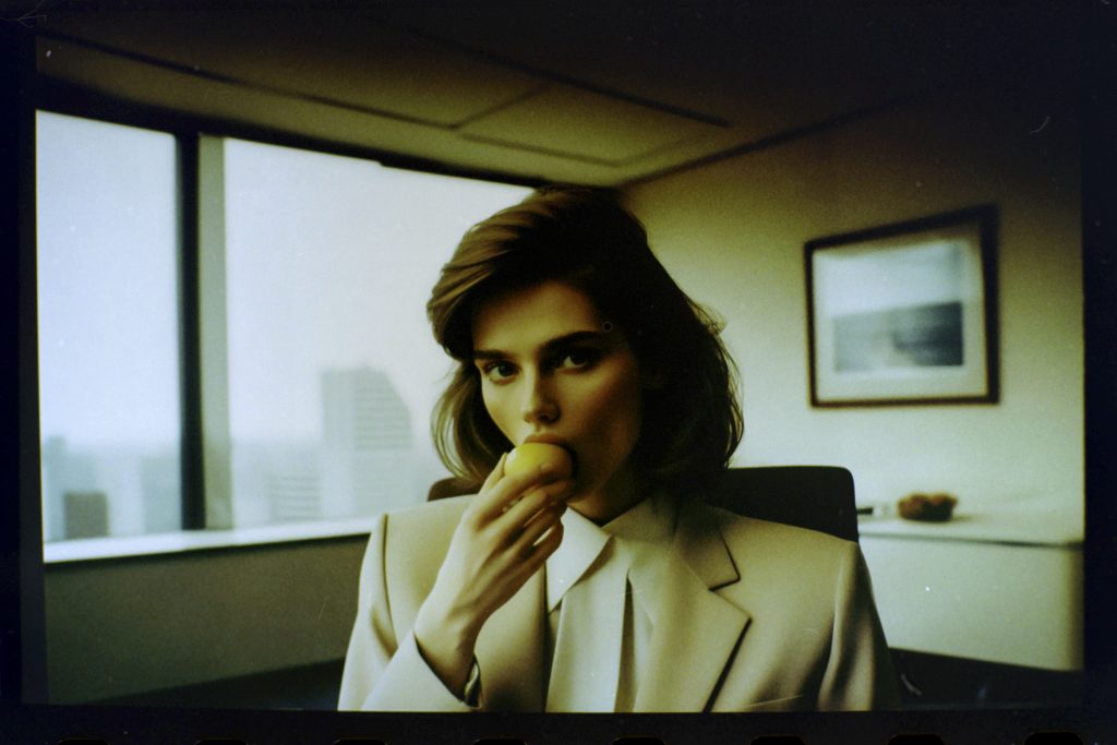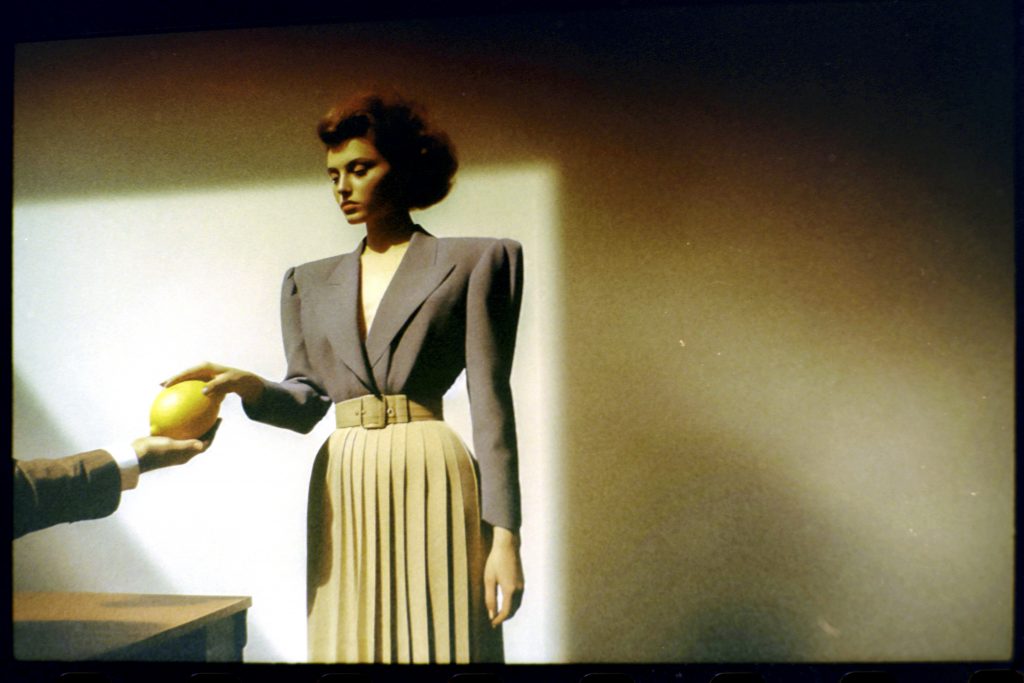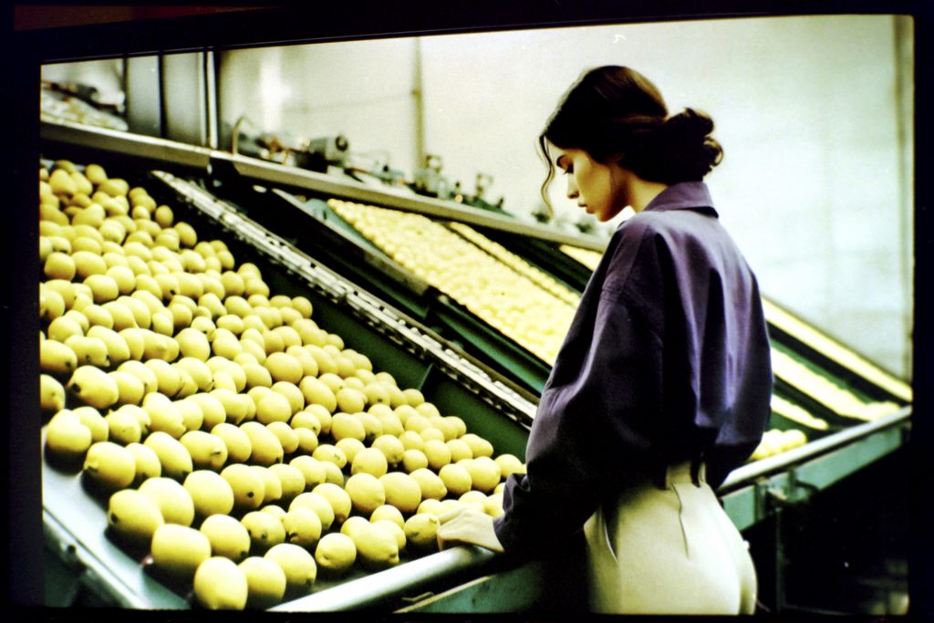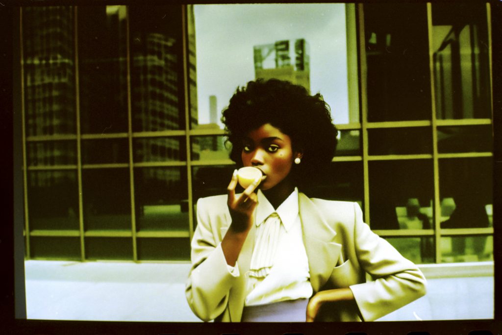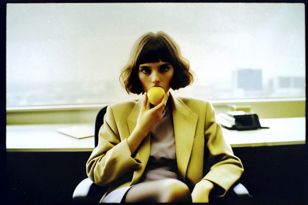 Using AI image generators and Photoshop to adjust the early weirdness of these tools to a viewable degree, a prompt generator was developed. This generator fed the machines with fashion combinations, photographic details, and the key element of a woman holding or eating a lemon.